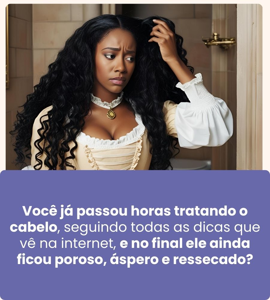 Eu sei o que funciona e o que é só fuleragem. Eu vejo todo dia mulheres perdidas, seguindo dicas que não dão certo, gastando rios de dinheiro com produto errado, e ainda sofrendo com o cabelo fraco, poroso e com corte químico.