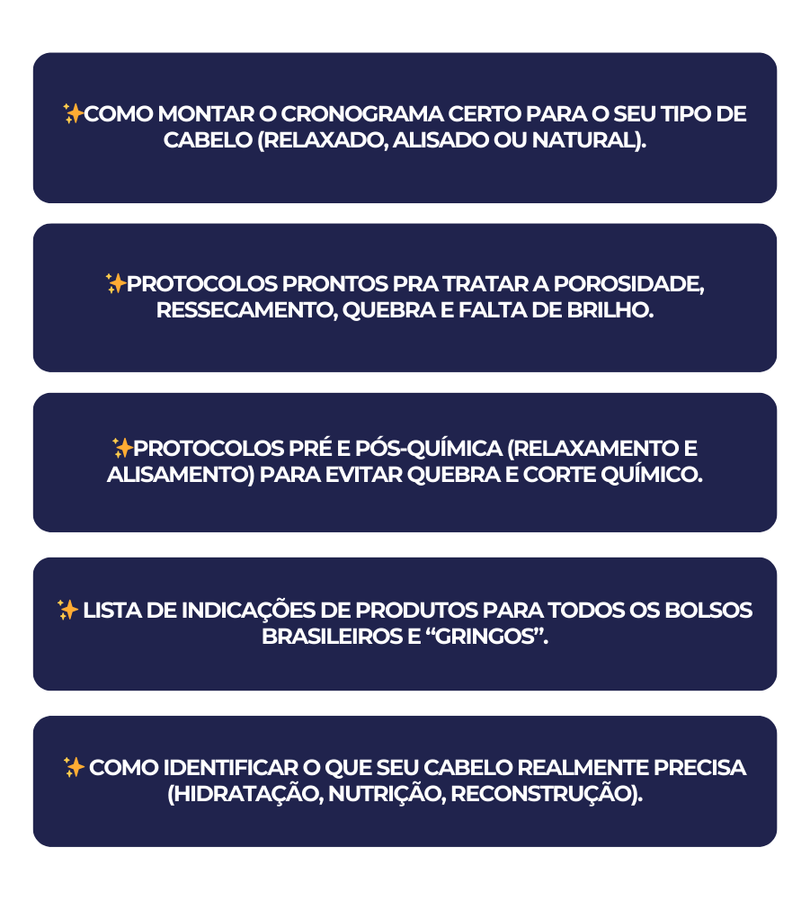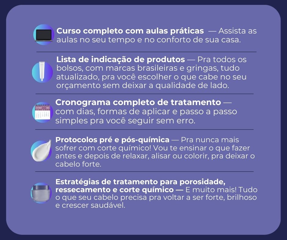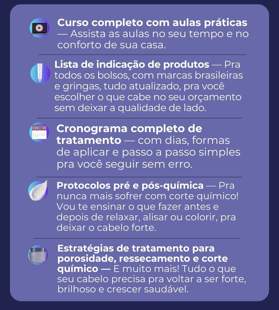 Você vai aprender o cronograma capilar certo, com a lista de indicações de produtos, sem precisar gastar fortunas e sem depender de salão.