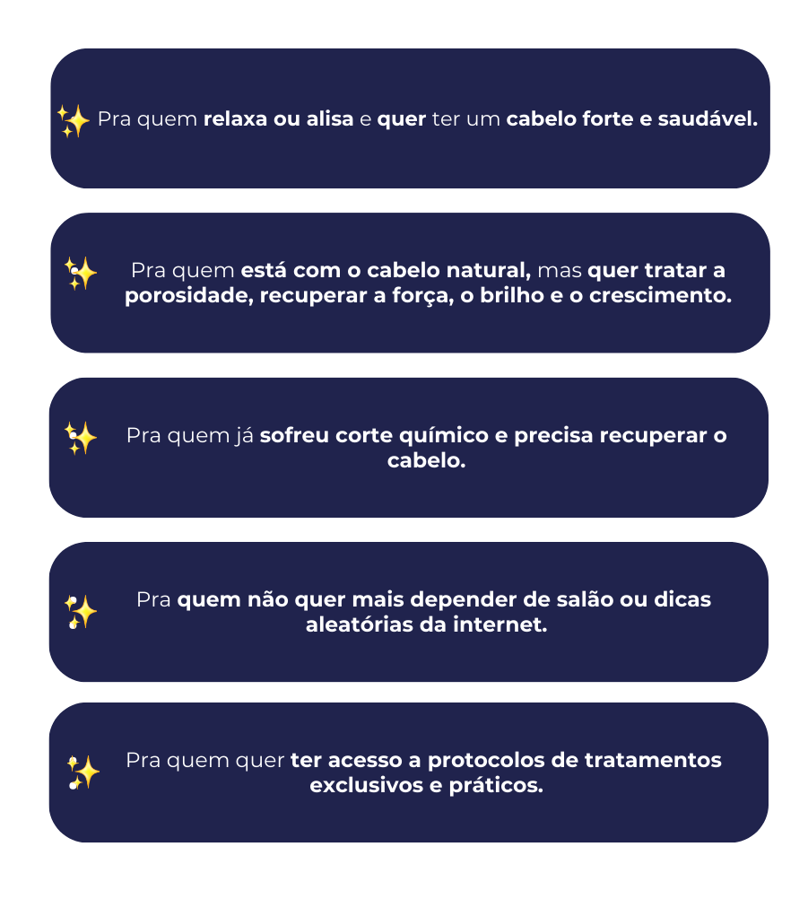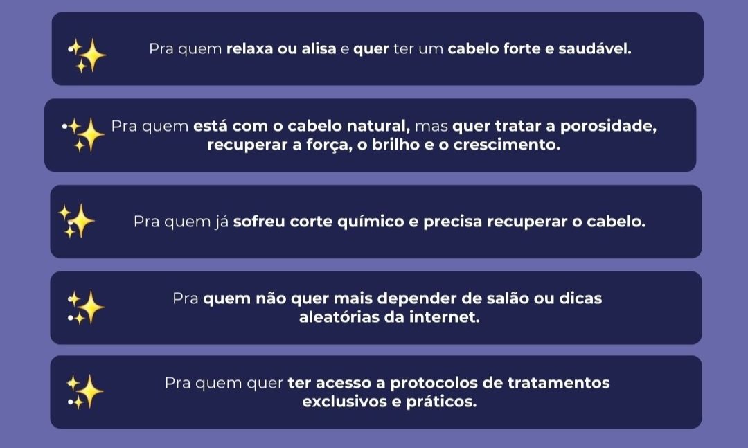 Se tu está cansada de comprar um monte de produtos que não funcionam e ficam mofando dentro do seu armário e mesmo assim seu cabelo está detonado, chegou a hora de investir em conhecimento, não em produto.