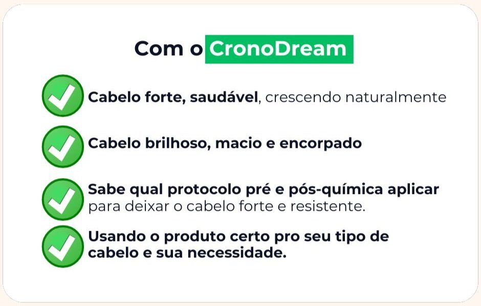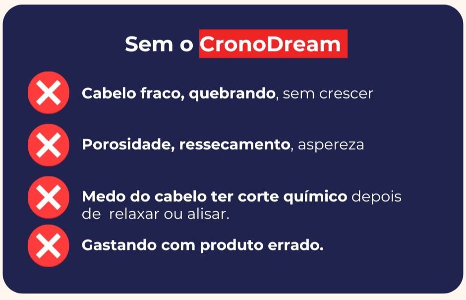 Por isso o CronoDream é diferente: é o cronograma pensado pra quem já tem química ou está com o cabelo fragilizado, que precisa de um cuidado verdadeiro, simples e que funciona.