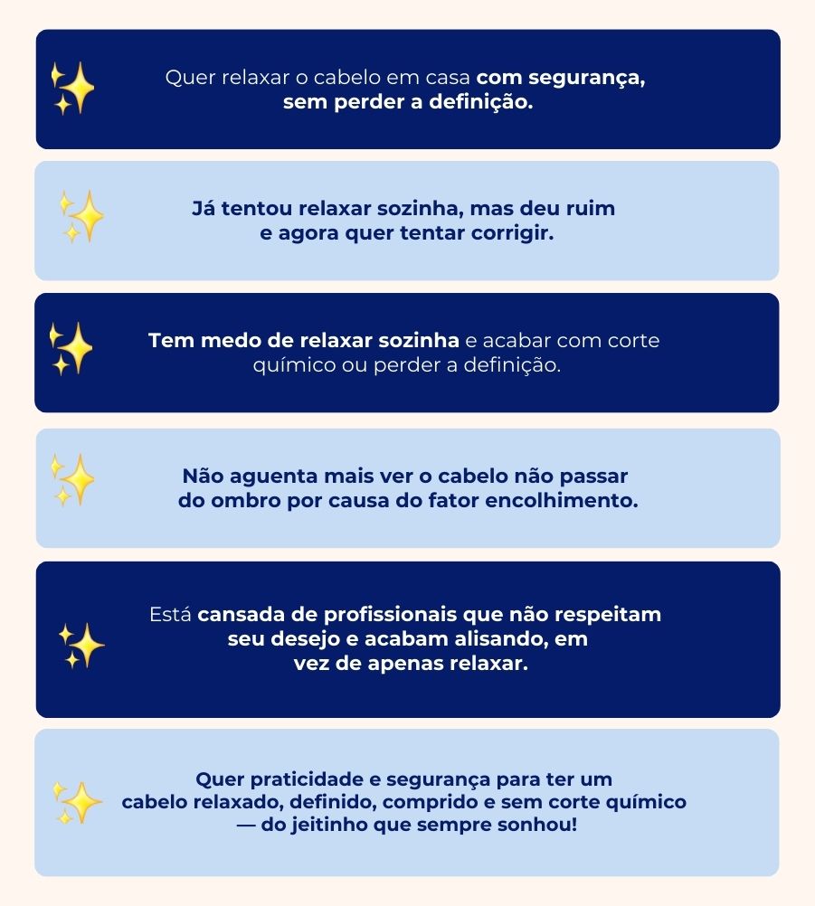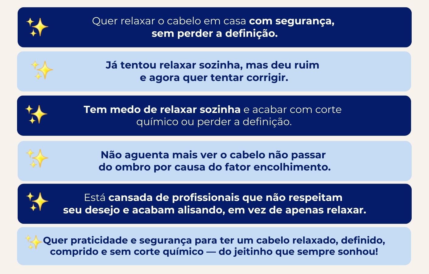 Se você está cansada do fator encolhimento e da falta de definição do seu cabelo cacheado ou crespo, e quer aumentar o comprimento dele em apenas um dia, no conforto da sua casa e com segurança, chegou a hora de acessar o passo a passo do método de relaxamento que já ajudou mulheres como você em mais de 18 países.