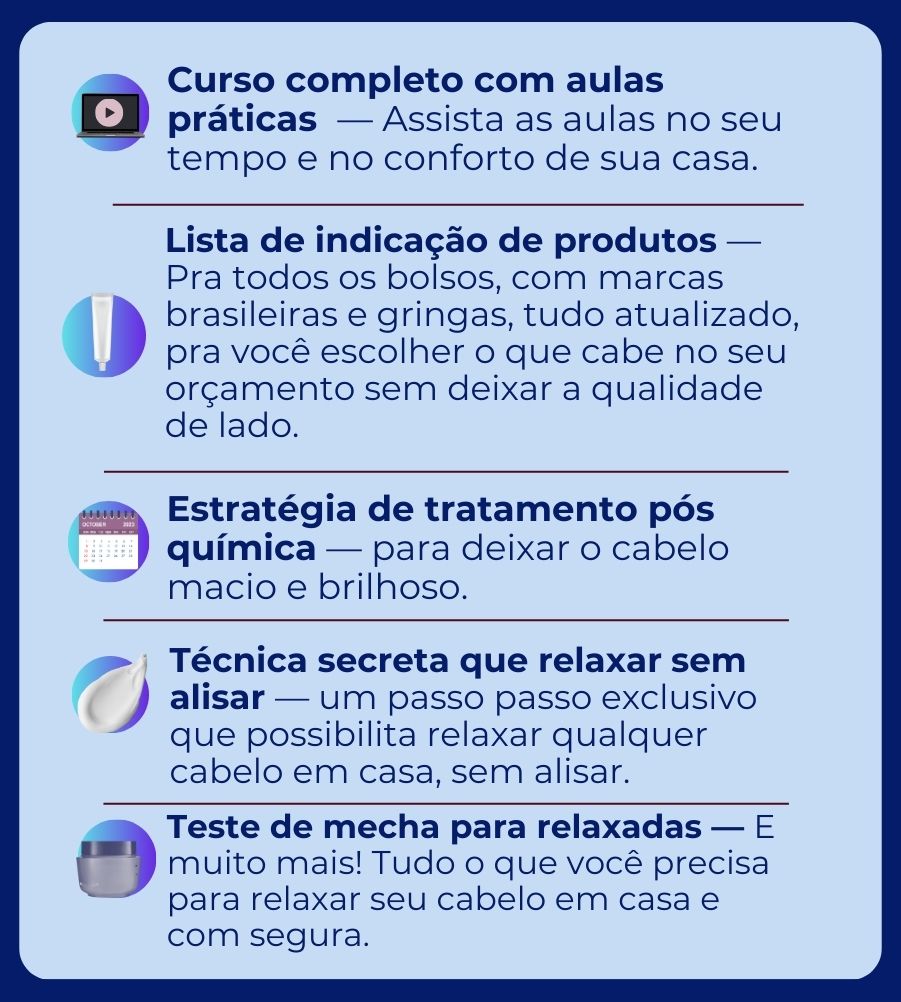 Eu tenho cabelo tipo crespo, cheio, algodão, cacheado e sem definição. Ela ensina a relaxar nesse curso?