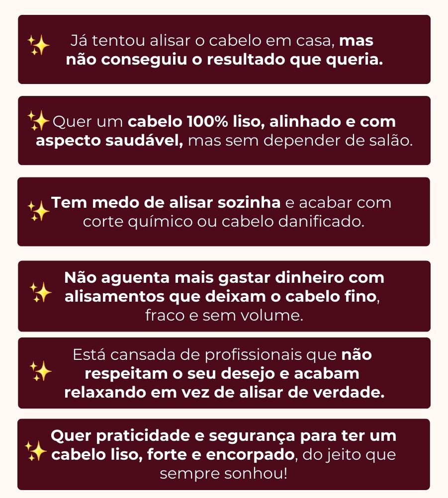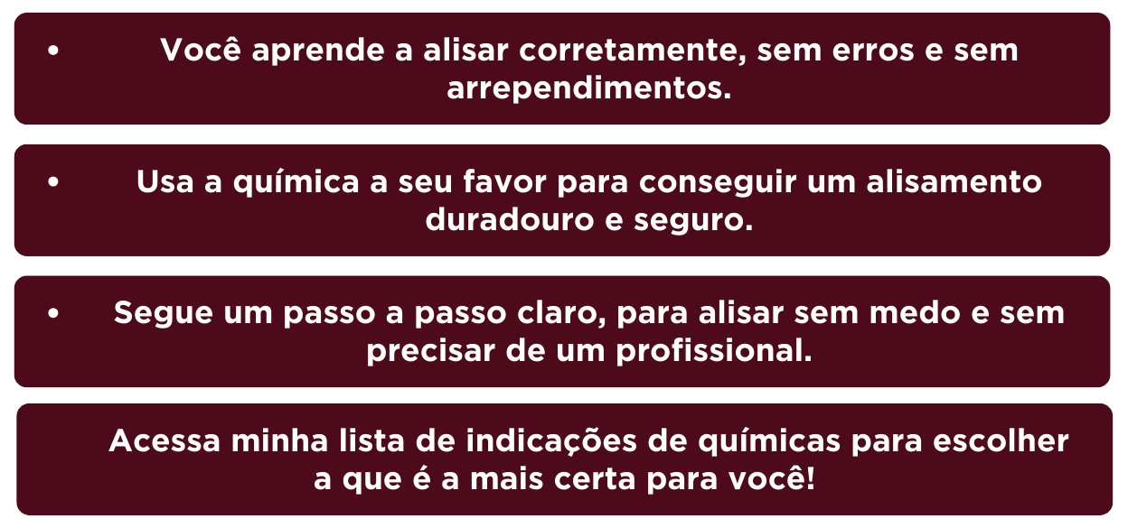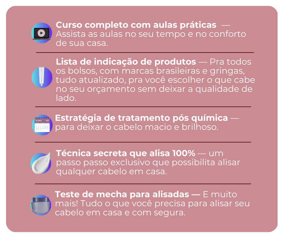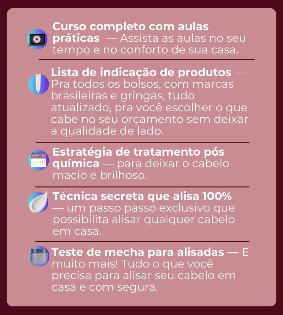 Você vai aprender a minha técnica de alisamento exclusiva, com a lista de indicações de produtos, sem precisar gastar fortunas e sem depender de salão.