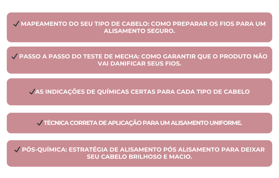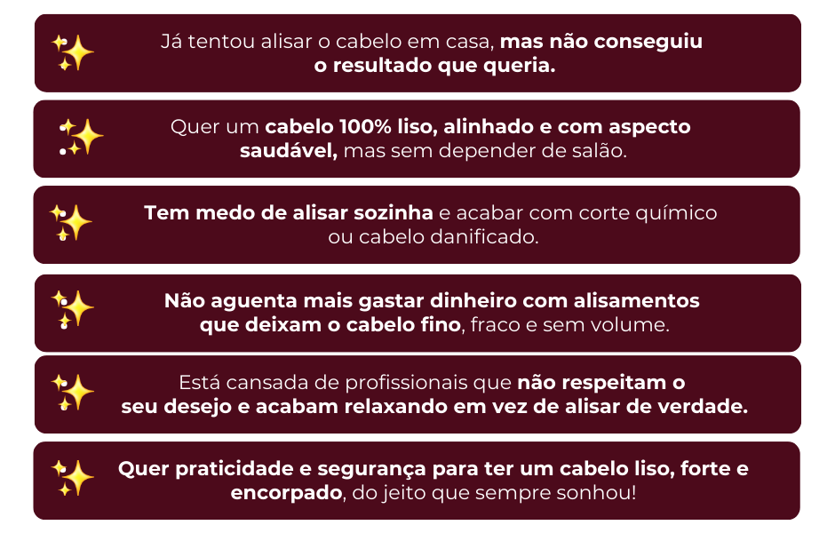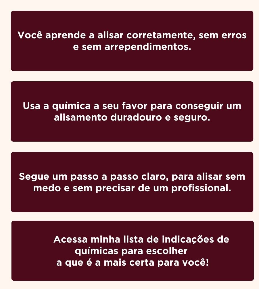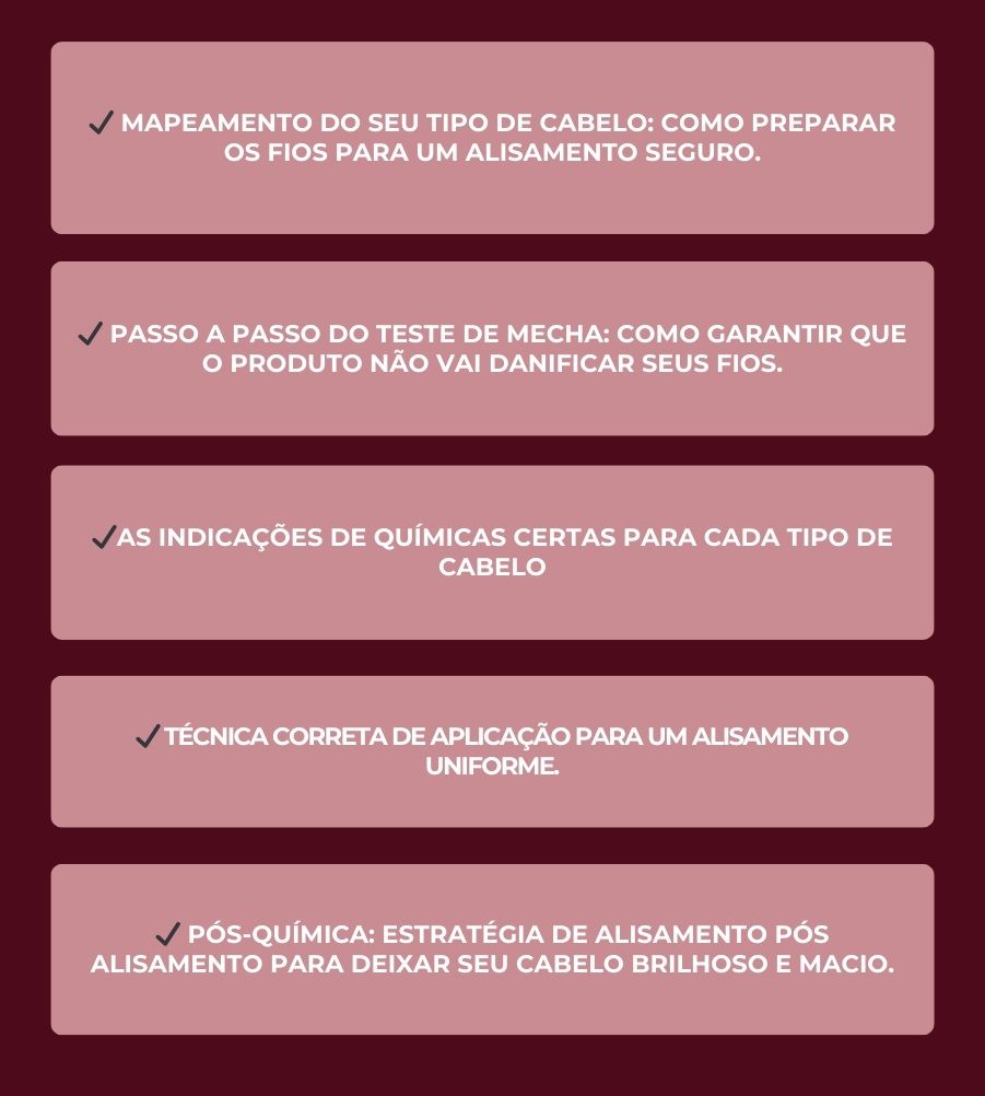 Você vai aprender a minha técnica de alisamento exclusiva, com a lista de indicações de produtos, sem precisar gastar fortunas e sem depender de salão.